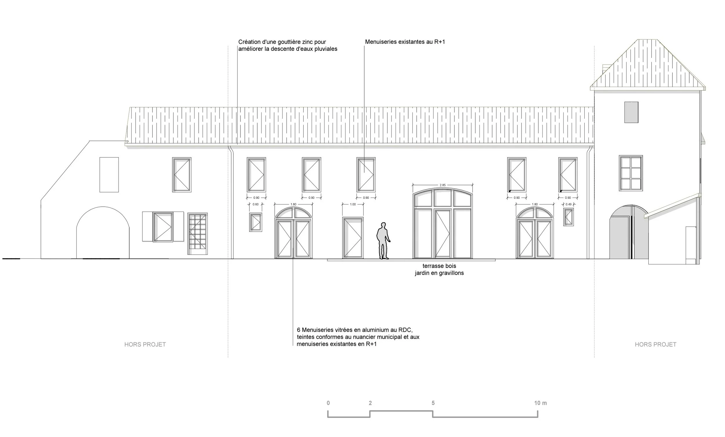 un corps de grange, avec son pigeonnier, ses boxs à bestiaux, et son volume principal recoupé de murs supportant les fermes de la charpente, va devenir la grande salle de restaurant, la salle de spectacle pour les concerts, avec toutes les facilités nécessaires dans un équipement recevant du public (cuisine industrielle, sanitaires, locaux techniques). La reprise sur les murs périphériques du poids de la charpente et de la couverture réhabilitée permet de dégager l’espace. La scène n’est matérialisée qu’avec subtilité au sol : il ne faut pas trop déterminer chaque usage, l’espace reste multi-fonctions.