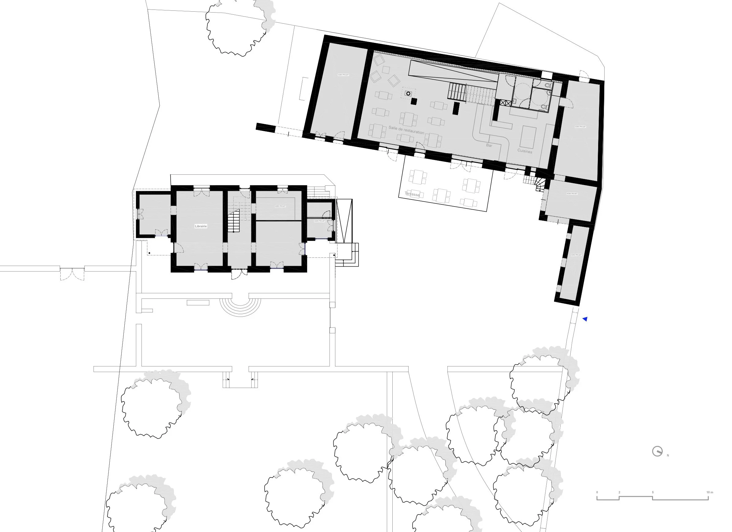 Une demeure cossue, en bon état, accueillera la librairie. Les étages sont à usage d’habitation privée. Le parvis, s’ouvrant sur l’est, donne sur l’ambiance de sous-bois qui protège de la route nationale, à peine perceptible en contre-bas. Dans la continuité, des jardins potagers, où un maraîcher s’affaire pour alimenter en produit frais le restaurant des Vinzelles.